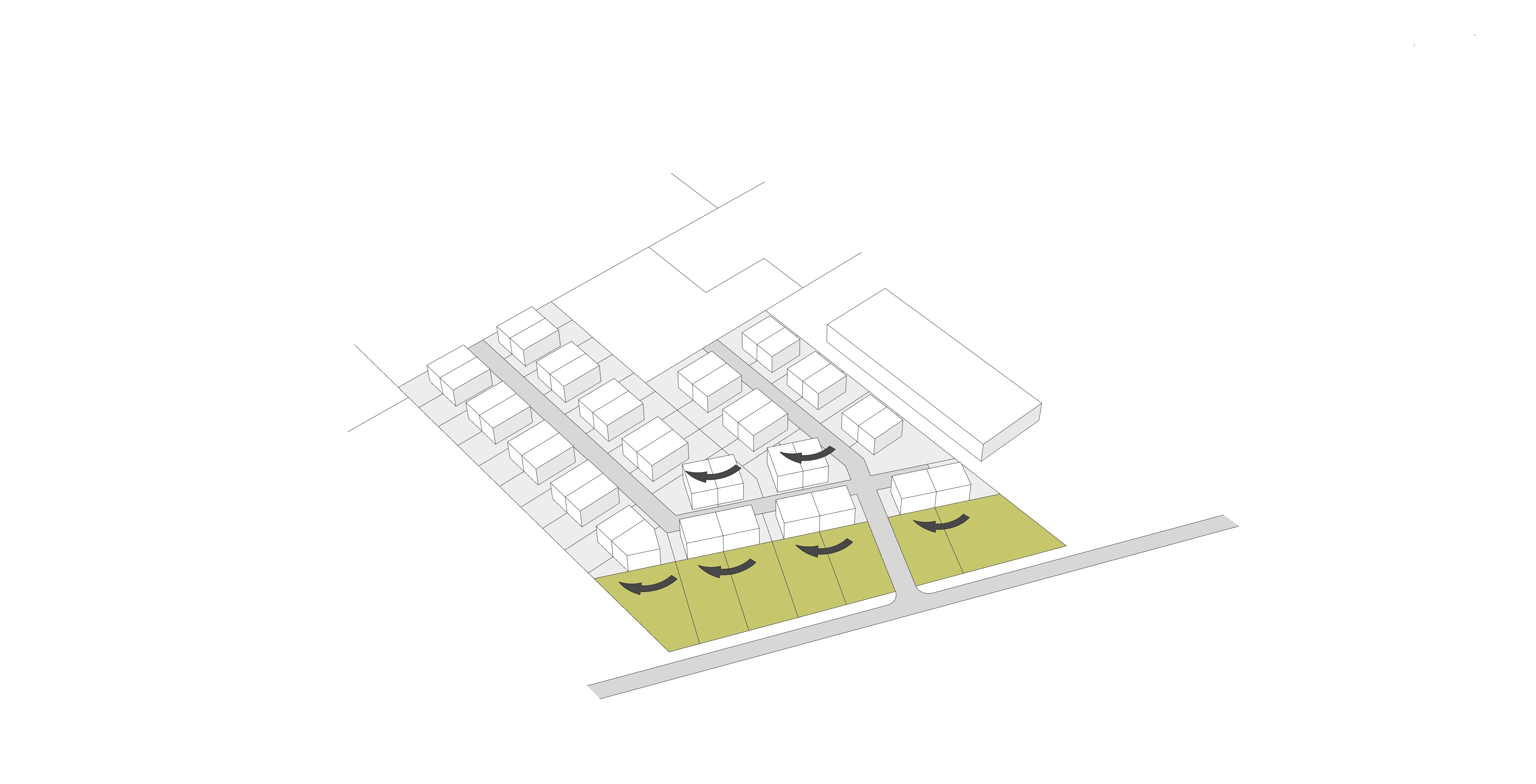 Istotą rozwiązań architektonicznych poszczególnych budynków jest ich integralność z terenami zieleni. Założeniem było stworzenie takiej struktury funkcjonalno-przestrzennej, która zapewniłaby mieszkańcom komfort i poczucie intymności podczas spędzania czasu w ogrodzie. Ze względu na intensywność zabudowy i bliskość ciągów komunikacji wewnętrznej osiedla poszukiwano rozwiązań kształtujących przestrzeń w sposób umożliwiający oddzielenie tych stref. Luźne skojarzenia przywołały odniesienie istoty muru jako budowli, która chroni fort przed dostępem z zewnątrz do sposobu wydzielania ogrodów w osiedlu. Postanowiono wykorzystać ten motyw w odwrotny sposób, tzn. lokalizując mur wewnątrz osiedla. Rozciągnięty wzdłuż wewnętrznych elewacji budynków tworzy granicę pomiędzy komunikacją a prywatnymi ogrodami.