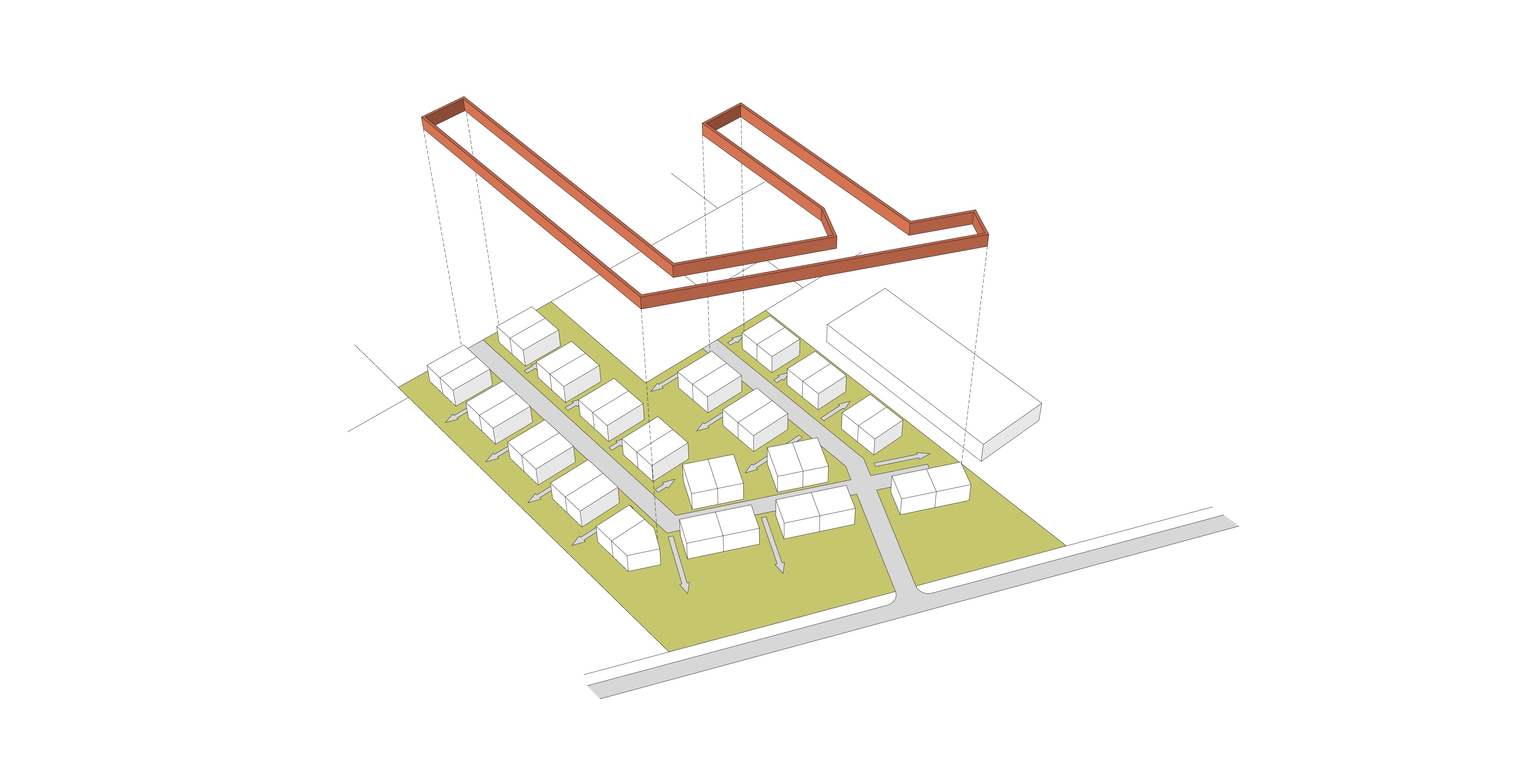 Element muru stał się również pretekstem do kształtowania różnych funkcji i przestrzeni- tworzy partery budynków, eleganckie wycofane strefy wejściowe, miejsca składowania odpadów, itp. Zróżnicowana linia ogrodzenia tworzy uskoki i przejścia i kadry dla osi widokowych. Wykorzystanie tego materiału oprócz tego, że stanowi elegancki detal wykończeniowy i podwyższa standard inwestycji, nawiązuje też do industrialnego charakteru otoczenia i jest ukłonem w kierunku historii i ducha miejsca.